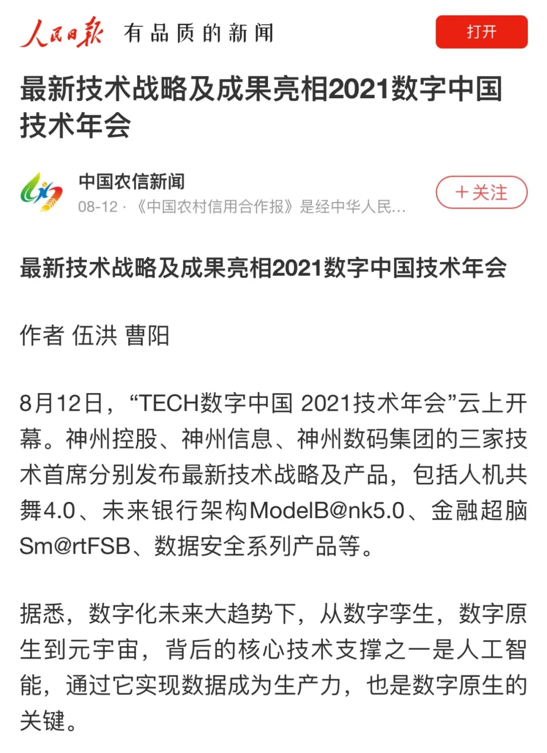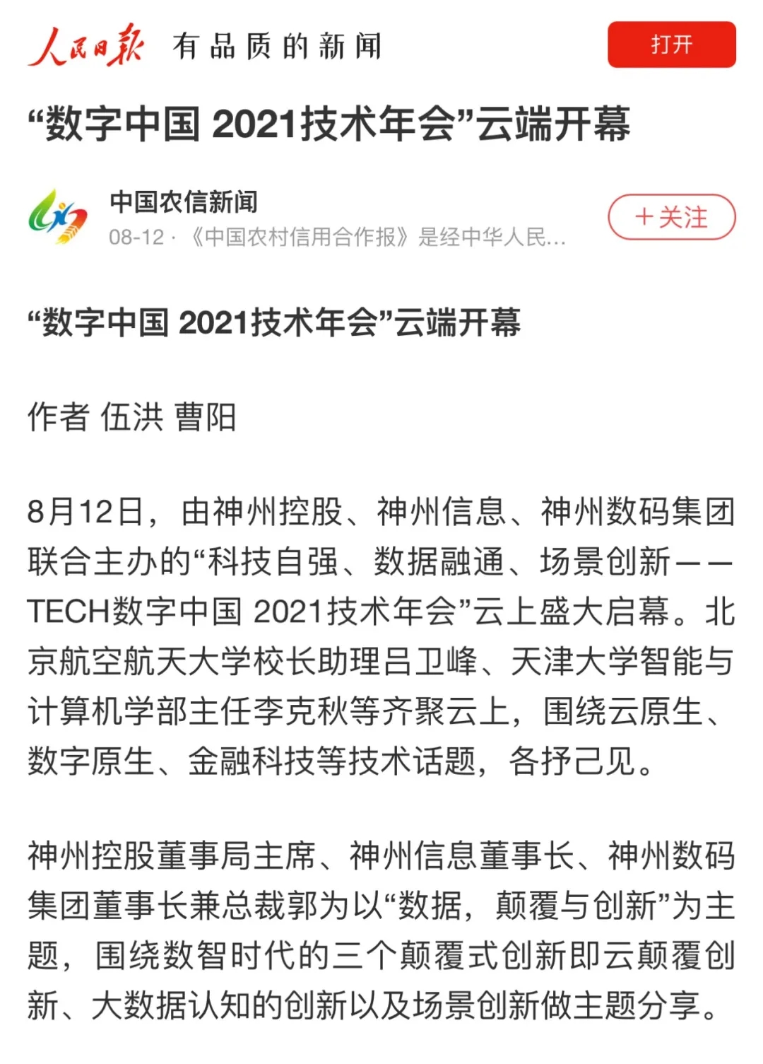 8月12日,由神州控股、神州信息、z6.com集团联合主办的“科技自强、数据融通、场景创新——TECH数字中国 2021技术年会”云上盛大启幕,发布神州信创云、ModelB@nk5.0、金融超脑Sm@rtFSB、云原生数字化安全底座、园区智能体等重磅产品,国内各大权威、影响力媒体多角度多频次对盛况进行报道!